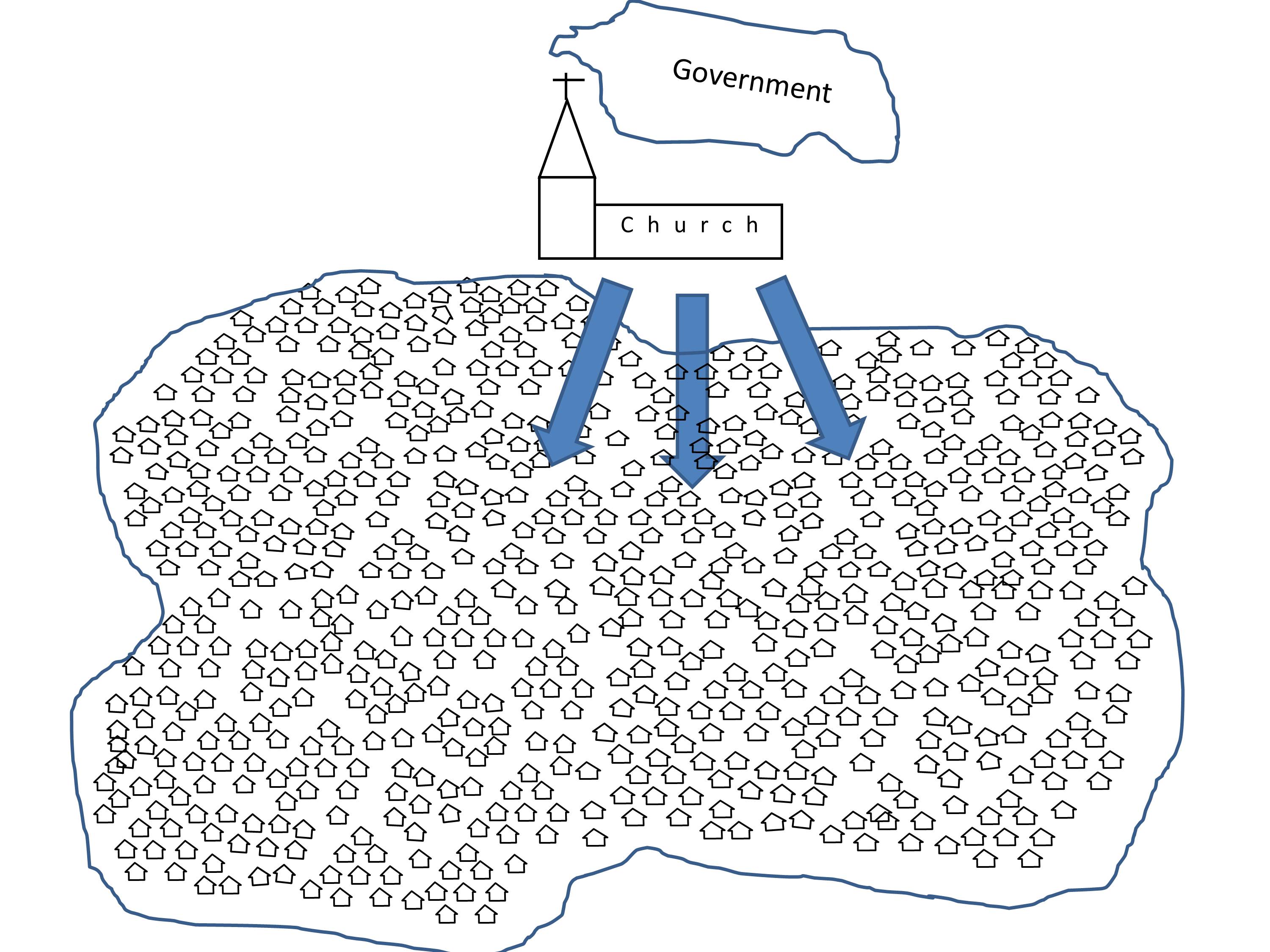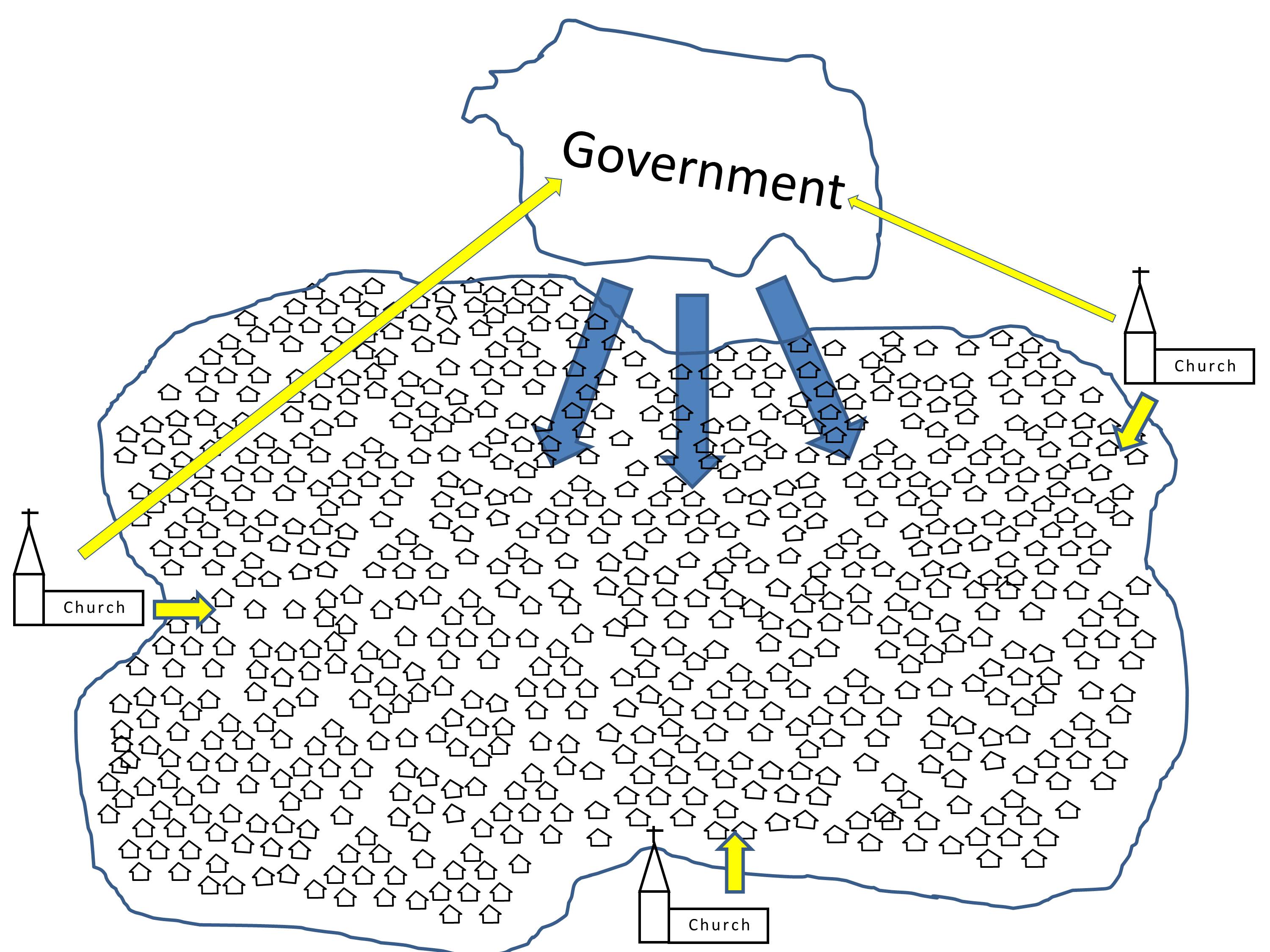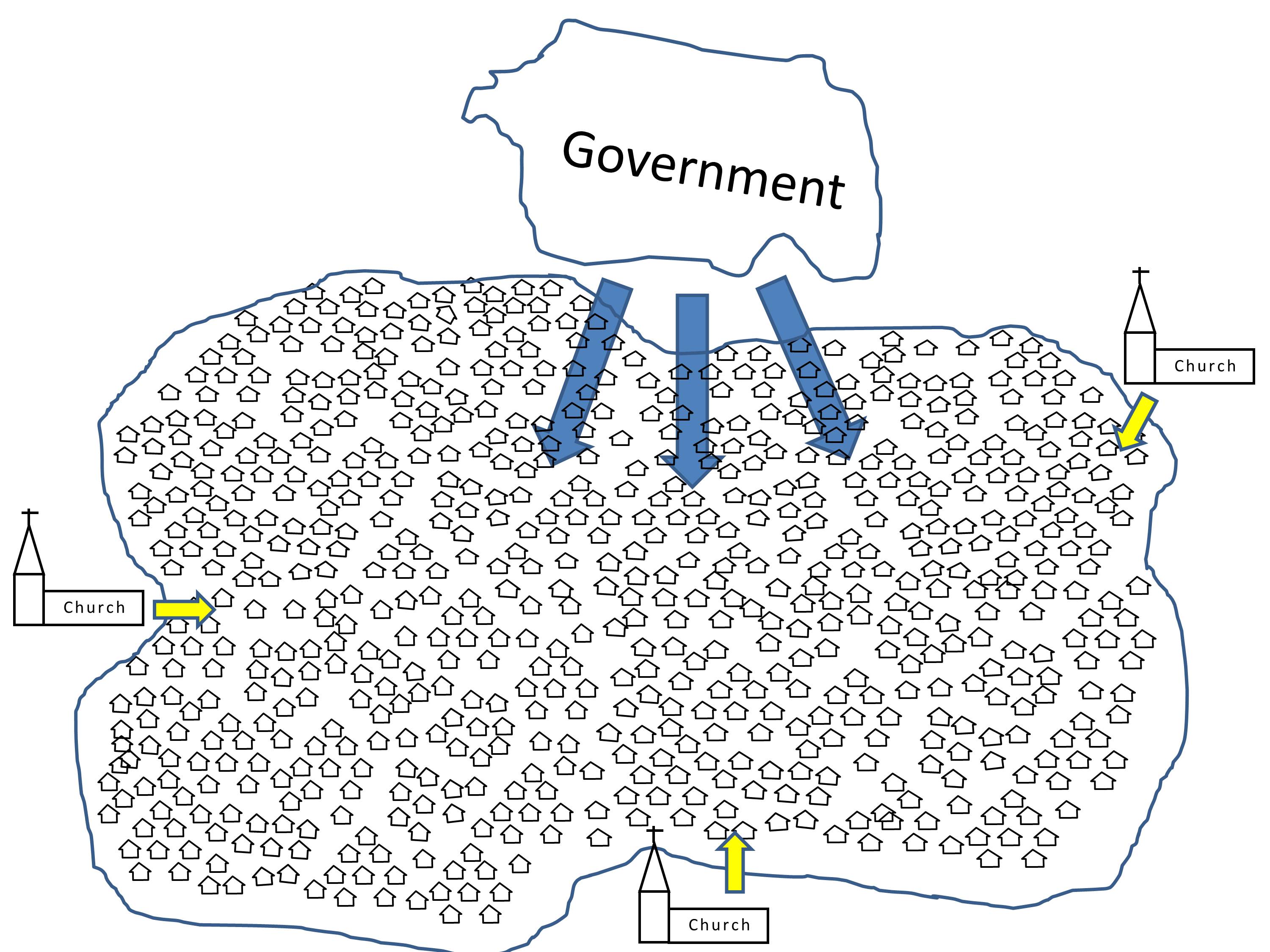 The church and the state both work from the edge of society. The government passes laws and issues decrees. It sends its agents and taxgatherers to enforce its power and control.